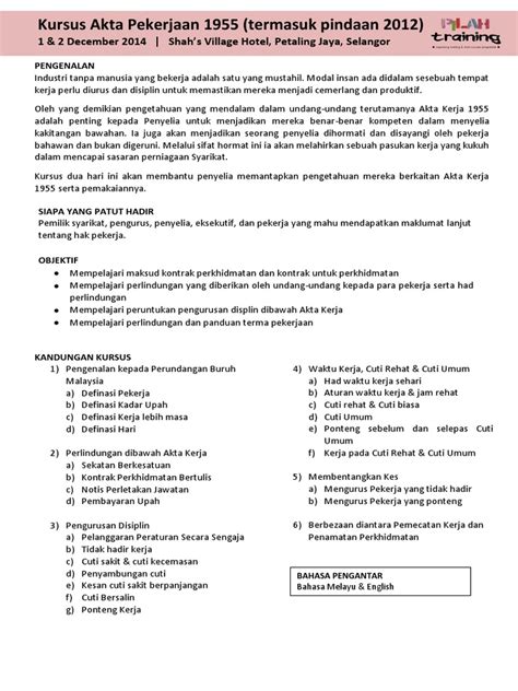 Pdf Full Labor Law Tutorial Pdf from i1.rgstatic.net Akta ini merangkumi banyak sektor dan bahagian. Akta itu dikenali sebagai dibawah akta pekerja 1955 (employment act 1955). Kelayakan cuti sakit bergaji setahun adalah. Wakil pas berucap di piket membantah pindaan akta pekerja 1955 yang berlangsung di taman tampoi indah, johor anjuran jerit. Pengenalan kepada akta kerja 1955 (edisi ketiga). 0 ratings0% found this document useful (0 votes). Akta pekerjaan 1955 atau akta 265 di gubal pada tahun 1955 dan telahdipinda hampir keseluruhannya pada tahun 1998. Elaun cuti bersalin seksyen 37, akta kerja 1955 60 hari cuti bergaji kepada pekerja yang: