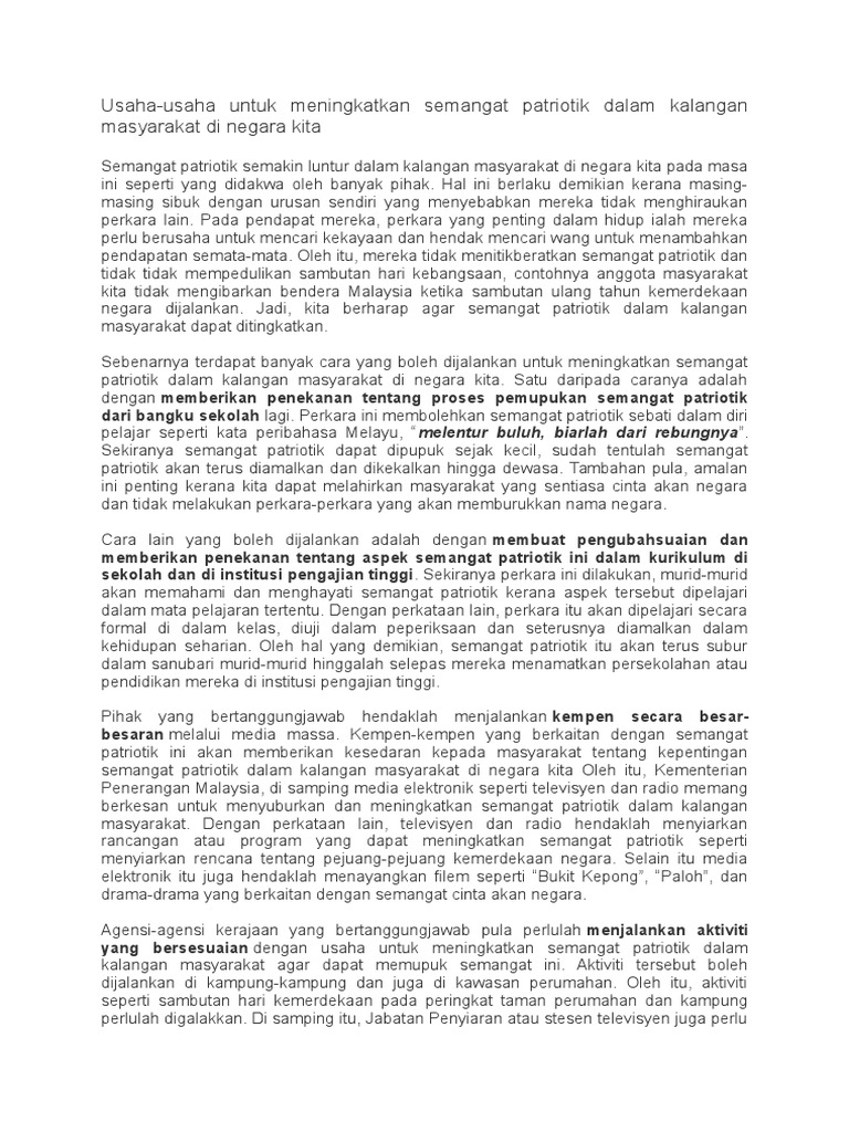 Usaha Usaha Yang Perlu Dilakukan Untuk Meningkatkan Semangat Patriotik Dalam Kalangan Remaja from imgv2-2-f.scribdassets.com Contoh karangan narasi tentang pengalaman pribadi singkat. Salah satu ciri yang perlu ada dalam diri setiap individu ialah semangat patriotisme. Semangat patriotik semakin luntur dalam kalangan masyarakat di negara kita pada masa ini seperti yang didakwa oleh banyak pihak. Contoh karangan langkah memupuk semangat patriotisme di dalam kalangan masyarakat di malaysia. Berikut adalah contoh esei karangan spm 2013 terbaik mengenai isu semasa. Rakyat yang patriotik diibaratkan seorang individu yang sanggup mengorbankan dirinya untuk kepentingan negara tanpa banyak alasan. Kebaikan lain semangat patriotisme di kalangan rakyat ialah ia dapat menjadi contoh kepada generasi muda. Barulah semangat patriotik di kalangan rakyat akan dapat disemai.