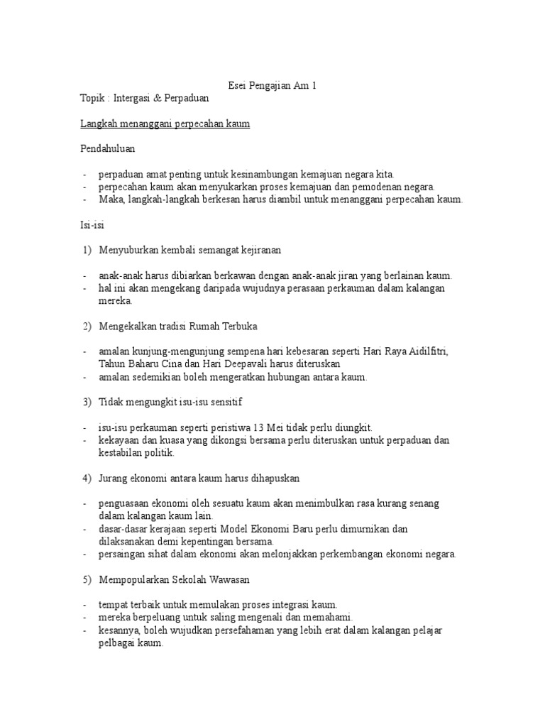 Nota pengajian am untuk pelajar tingkatan 6. Perpaduan memainkan peranan penting dalam memacu kestabilan dan kemajuan negara. Persatuan dan perpaduan yang ada di tengah masyarakat akan menjadikan integrasi national tingkat negara solid. Perpaduan dan integrasi halangan2 dalam memupuk perpaduan. Buku panduan rancangan integrasi murid untuk perpaduan, kpm, 2005. Video nota pengajian am ini dihasilkan untuk tujuan memperbanyak sumber rujukan secara online dalam kalangan pelajar prau. Pengajian am 2 (900/2) soalan karangan bahagian a. Perpaduan boleh diertikan sebagai satu proses yang menyatupadukan seluruh masyarakat dan negara supaya setiap anggota masyarakat dapat membentuk satu identiti dan nilai bersama serta perasaan cinta dan banggakan tanah air. Kepentingan perlembagaan di sesebuah negara itu juga mempunyai haluan tertentu. Masyarakat majmuk yang terdiri dari pelbagai kaum di malaysia ini mengamalkan semangat perpaduan dan integrasi bagi mengekalkan kesejehteraan negara bersama. Kawasan kediaman merapatkan jurang perbezaan di kalangan generasi pertama felda kesumba jengka 9 anakjengkakesumba abstrak persoalan besar kini, adakah perpaduan. 0 ratings0% found this document useful (0 votes). Savesave integrasi dan perpaduan for later.