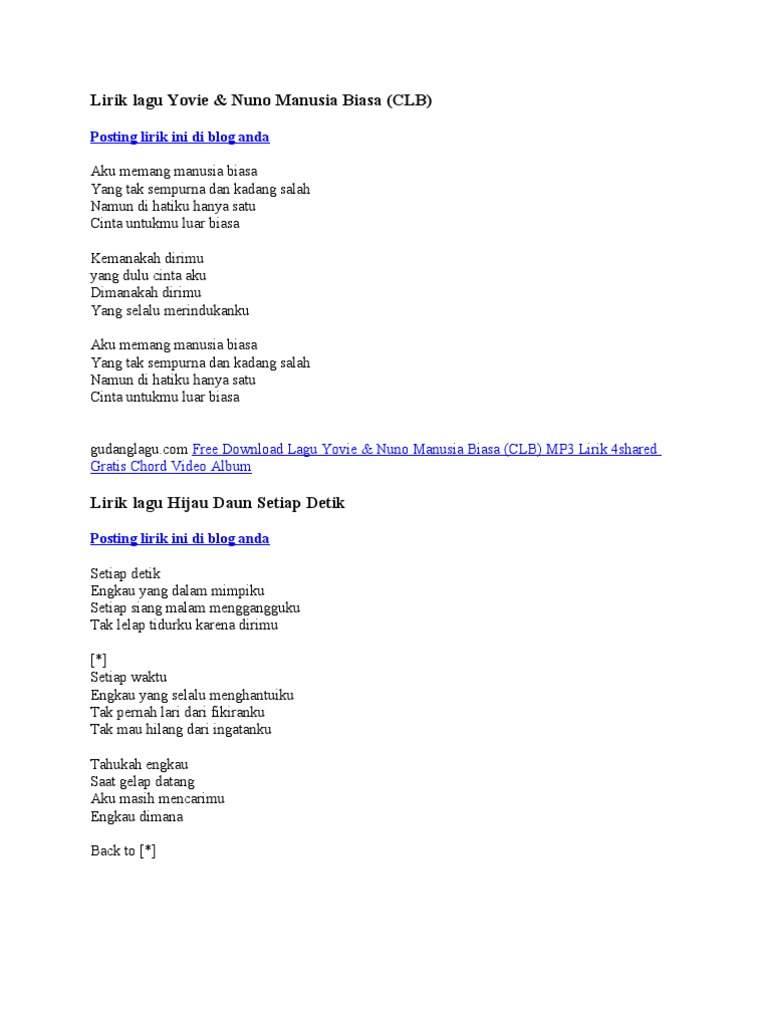 (c) 2014 sony music entertainment music video by yovie & nuno performing janji suci. Aku memang manusia biasa yang tak sempurna dan kadang salah namun di hatiku hanya satu cinta untukmu luar biasa. Aku memang manusia biasa yang tak sempurna dan kadang salah namun di hatiku hanya satu cinta untukmu luar biasa aku memang manusia biasa yang tak sempurna dan. Yovie menjaga hati masih ku ingat selalusaat kau berjanji padakutakkan pernah ada cinta yang lainnyaterasa begitu indah tapi semua berbedasaat kau kenali dirinyasadarkah. Namun di hatiku hanya satu. Apa sebenarnya yang terjadi sebenarnya? Masih 'ku ingat selalu saat kau berjanji pada ku takkan pernah ada cinta yang lainnya terasa saat kau sebut namanya aku memang manusia biasa yang tak sempurna dan kadang salah namun di hati ku hanya satu cinta untuk mu luar biasa. Lagu manusia biasa (clb, cinta luar biasa) merupakan salah satu single hits dari grup musik yovie & nuno. I won't change easily aku takkan mudah berubah. Aku memang manusia biasa yang tak sempurna dan kadang salah namun di hatiku hanya satu cinta untukmu luar biasa. C f andaikan saja kau tahu g f em aku takkan mudah berubah am dm aku kan bertahan selalu bertahan f g sampai waktu memanggilku. Ami award untuk tim produksi suara terbaik. Lagu ini diciptakan oleh yovie widianto yang bercerita tentang manusia biasa yang memiliki cinta luar biasa.